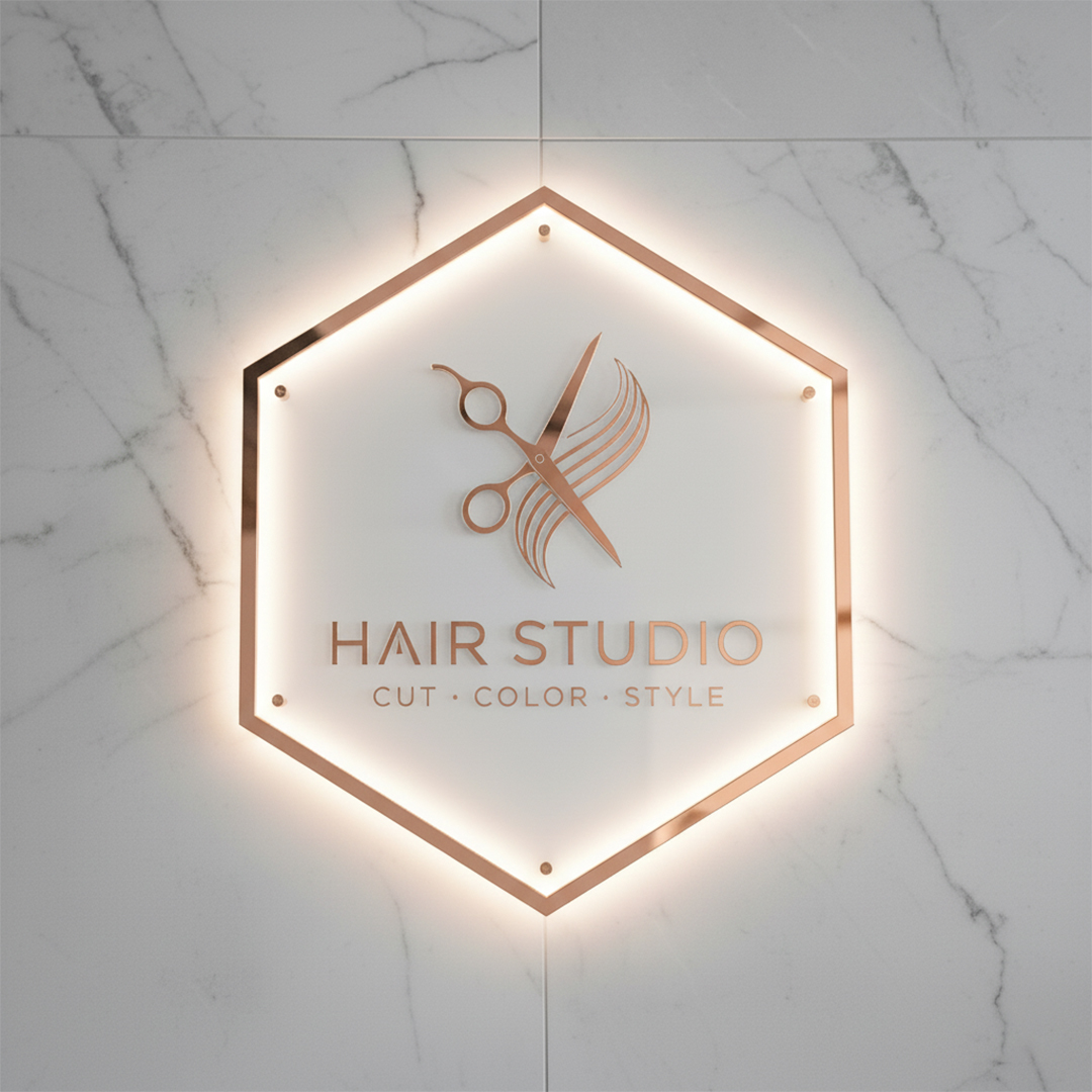 Give your brand a premium look with our Custom Hexagon Acrylic Logo Sign for Modern Businesses perfect for salons, boutiques, offices, spas, and studios. Each sign is made from high-quality glossy acrylic with a smooth finish and optional LED backlight for a soft glow effect.